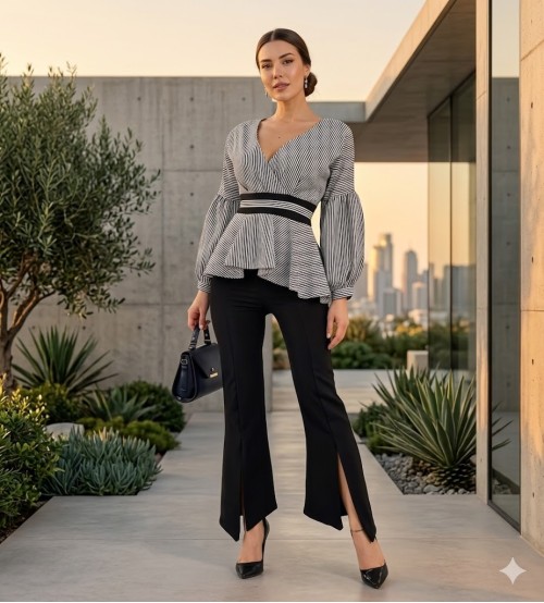 Jolie Siyah Beyaz Çizgili Kuşaklı Balon Kol Gömlek-Pantolon Bayan İkili Takım 0217